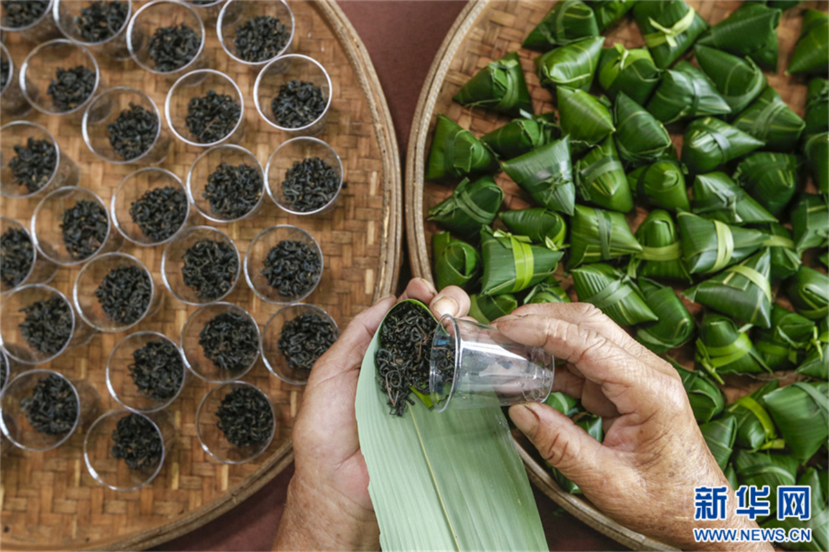 6月5日,在安徽省黃山市祁門縣古溪鄉(xiāng)際源村,茶工在展示包好的“粽茶”。
