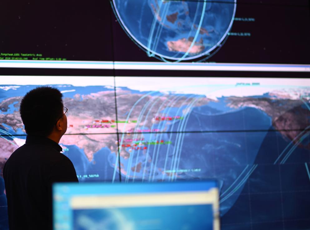 一塊超大顯示屏實(shí)時顯示著衛(wèi)星各項(xiàng)數(shù)據(jù)
