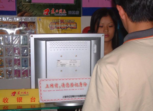 圖為2002年,《互聯(lián)網(wǎng)上網(wǎng)服務(wù)營業(yè)場所管理條例》施行,上海某網(wǎng)吧柜臺上寫著“上網(wǎng)前,請您登記身份”。(視覺中國)