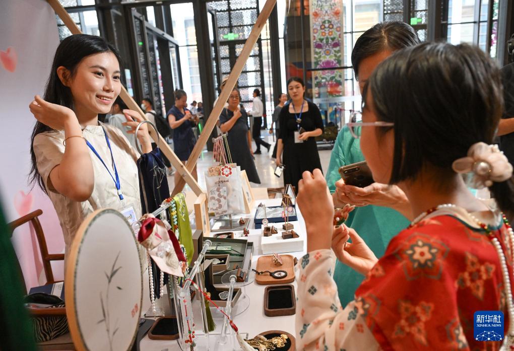 8月7日,在非遺市集上,一名攤主(左)向游客介紹飾品。