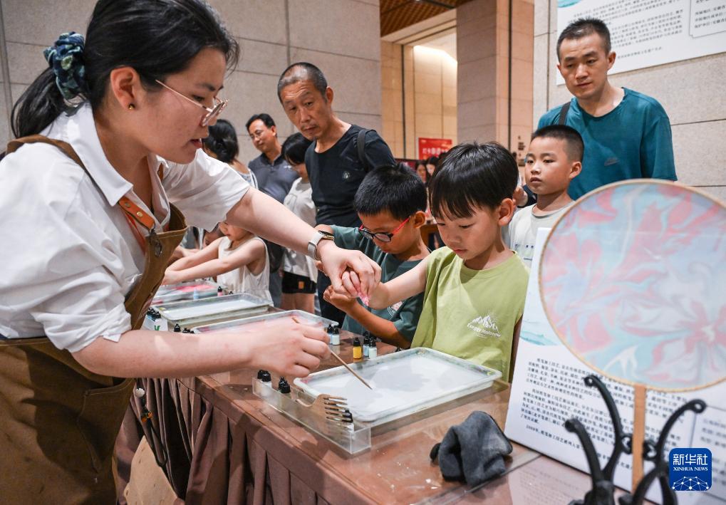 8月7日,在非遺體驗區(qū),小朋友在工作人員指導(dǎo)下體驗紙箋加工技藝。