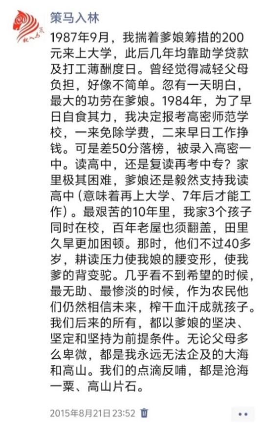 2015年8月21日微信朋友圈帖文,此帖點(diǎn)贊評論互動(dòng)量500多次。