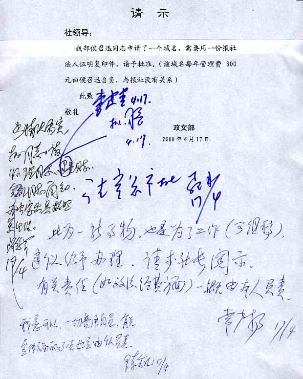 2000年4月,我覺得域名是個(gè)好東西,想去注冊,需要單位批準(zhǔn),部門領(lǐng)導(dǎo)和社領(lǐng)導(dǎo)開放開明,理解并支持。當(dāng)然最后也沒用著報(bào)社的執(zhí)照,因?yàn)槲醋?cn而注冊了.com,后者不需要單位證明。當(dāng)時(shí)可以申請三個(gè)字母的域名,比如i18、u18,最后我還是選了we18.com,“18”是“要法”“十八歲”。第二年,又申請了we01.com和we01.net。這三個(gè)頂級國際域名一直續(xù)費(fèi)持有至今。