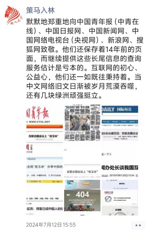 2024年7月3日,我發(fā)了一條朋友圈:前些天看到有人說網(wǎng)絡(luò)“崩塌”,有點(diǎn)著慌,馬上去找以前寫的一些帖文,真發(fā)現(xiàn)了問題。多年前可以搜到數(shù)千上萬條自己寫的稿子或與己有關(guān)的信息,現(xiàn)在去重、有用的所剩不多,還被一些收費(fèi)網(wǎng)站囤去一些,不交錢不讓看。QQ空間日志(騰訊博客)的一千多篇還在,互動也在,鏈接卻多成死鏈。新浪博客的一千多篇也在,互動沒了,考慮到博主需要,設(shè)置了備份按鈕,確實(shí)負(fù)責(zé)任。早已停服的博客中國,竟然還能打開。鏈接的新聞網(wǎng)頁還在的,有新浪網(wǎng)、中國青年報中青在線、中國日報網(wǎng)、中國新聞網(wǎng)、央視網(wǎng)、搜狐網(wǎng)等。包括人民網(wǎng)、新華網(wǎng)、中國網(wǎng)、國際在線、央廣網(wǎng)等大多數(shù)新聞網(wǎng)站及騰訊新聞、網(wǎng)易新聞、鳳凰新聞等,已經(jīng)404或403,而我最多的鏈接是人民網(wǎng)的,真是遺憾。對低效益的冷寂長尾內(nèi)容,很多網(wǎng)站平臺不愿再運(yùn)營維護(hù),便卸載斷服。“互聯(lián)網(wǎng)是有記憶的”,這話需要加以限定了,十年記憶就不容易,“永久”“免費(fèi)”已是傳說。接下來,有用的盡快備份吧,不管微博微信短視頻啥的,來有影去無蹤,或終將煙消云散南柯夢。值得敬佩的是一些良心平臺,尚能以公益為重,秉持初心,堅(jiān)持至今,繼續(xù)提供信息服務(wù),不容易不簡單。