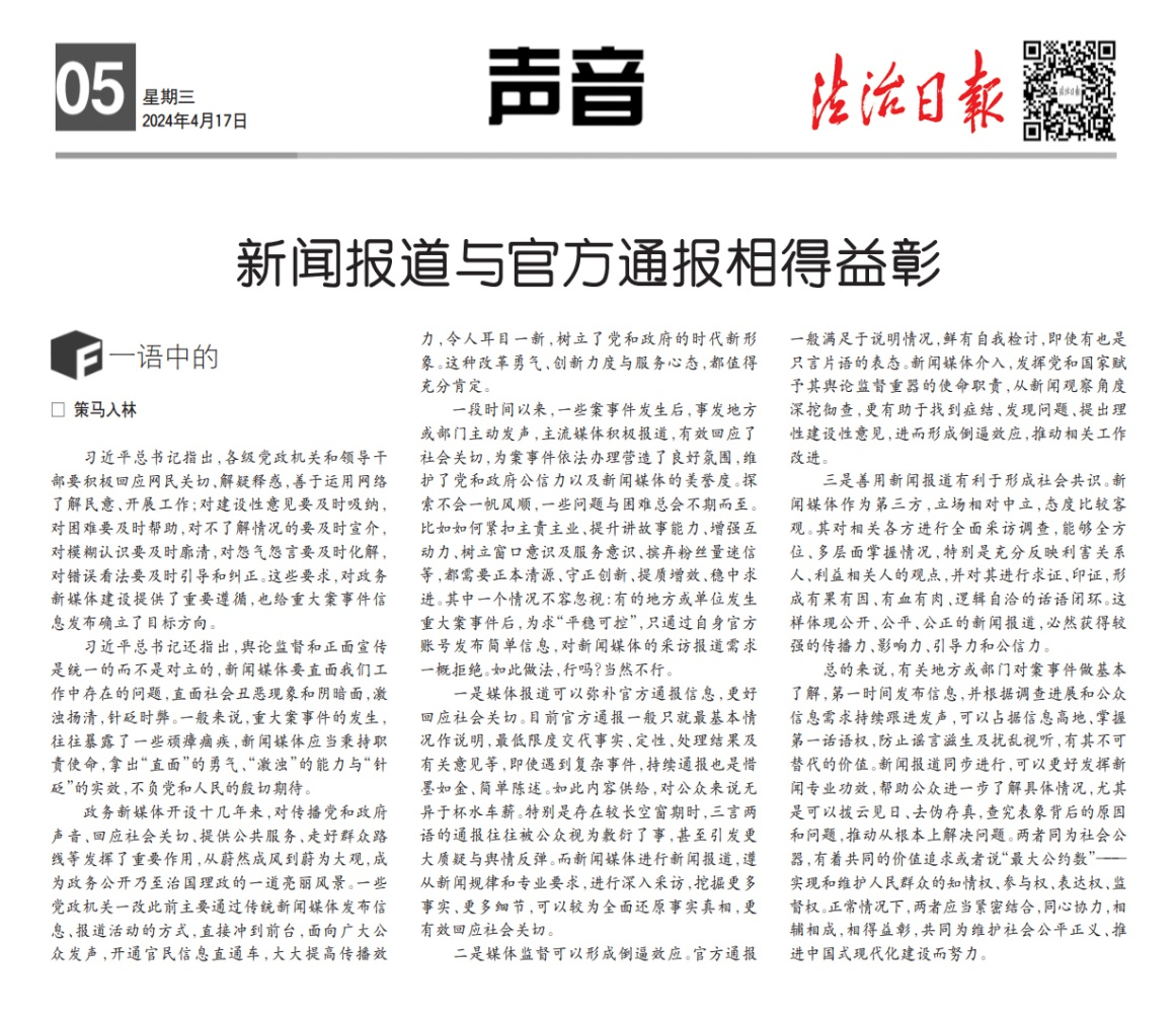 《新聞報道與官方通報相得益彰》法治日報 中國記協(xié) 2024-04-17