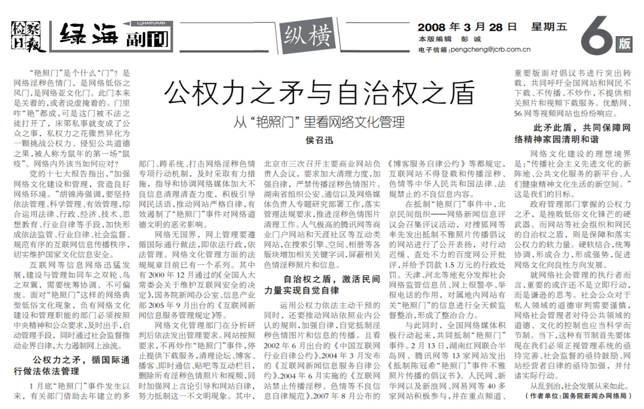 針對“艷照門”等網(wǎng)絡(luò)低俗文化現(xiàn)象的治理,撰寫《公權(quán)力之矛與自治權(quán)之盾——從“艷照門”里看網(wǎng)絡(luò)文化管理》,刊于2008年3月28日《檢察日報》。文章提出,負(fù)有網(wǎng)絡(luò)文化建設(shè)和管理職能的部門要遵循國際通行做法,依法行政,依法管理,及時出手,啟動管理手段。運(yùn)用公權(quán)力依法主動干預(yù)的同時,還要推動網(wǎng)站依照業(yè)內(nèi)公認(rèn)的規(guī)則,加強(qiáng)自律,自覺抵制淫穢色情圖片和信息的傳播。政府管理部門掌握的公權(quán)力之矛,是挫敗低俗文化鋒芒的硬武器。而網(wǎng)站等社會組織和網(wǎng)民的自治權(quán)之盾,則是保障和落實(shí)公權(quán)力的軟力量。硬軟結(jié)合,統(tǒng)籌協(xié)調(diào),形成合力,促進(jìn)網(wǎng)絡(luò)文化良性發(fā)展。就網(wǎng)絡(luò)社會管理的執(zhí)行者而言,非常重要的一點(diǎn)是謙遜的思考。社會公眾對于私人領(lǐng)域的道德審判需要謹(jǐn)慎,網(wǎng)絡(luò)社會管理者對待公共領(lǐng)域的管控也應(yīng)當(dāng)科學(xué)而節(jié)制。當(dāng)下,管理系統(tǒng)亟待完善,社會監(jiān)督亟待鼓勵,網(wǎng)站經(jīng)營者自律亟待加強(qiáng)。