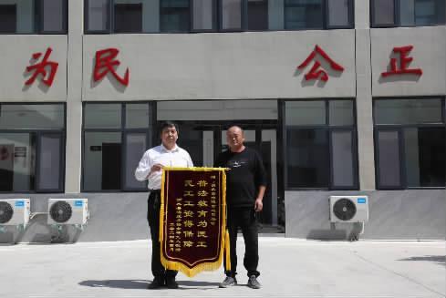 圖為“五一”假期期間,當(dāng)事人李某為河南省商水縣人民法院城關(guān)人民法庭庭長(zhǎng)訾連國(guó)(左)送來(lái)了錦旗。資料圖片