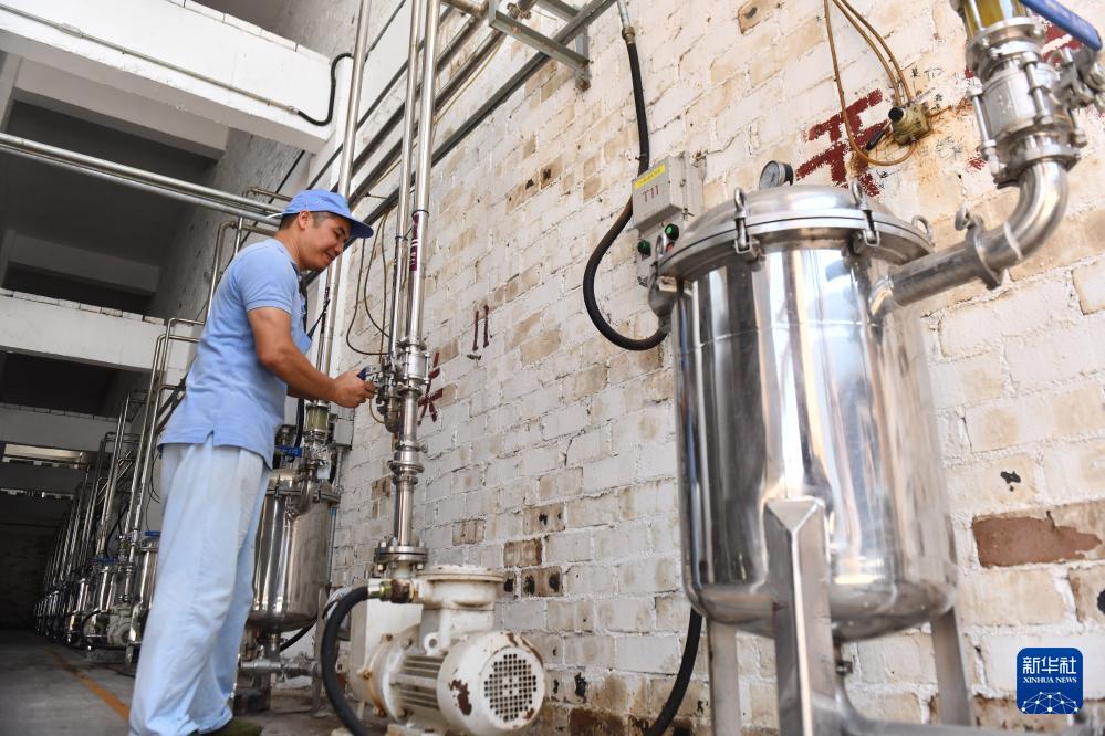 在廣西仙草堂制藥有限責(zé)任公司青蒿素提煉車間,技術(shù)人員在作業(yè)(8月27日攝)。
