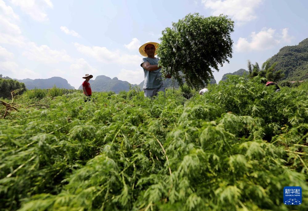 在廣西仙草堂制藥有限責任公司基地,工人在采收青蒿(2022年7月31日攝)。