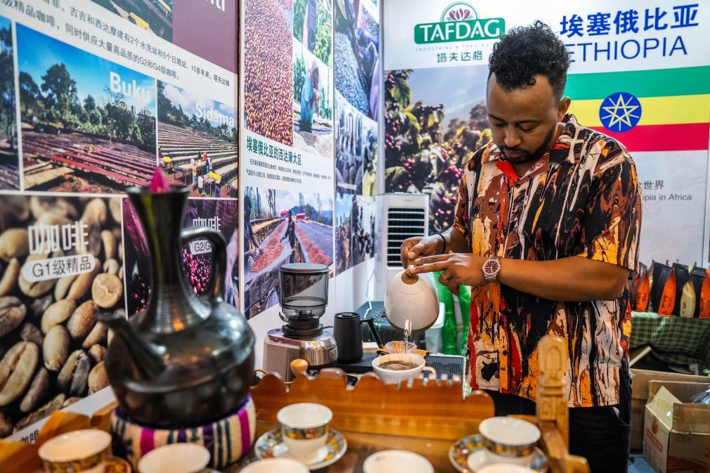 7月24日,在第八屆南博會(huì)咖啡產(chǎn)業(yè)館,一名埃塞俄比亞展商在沖泡咖啡。(新華社記者胡超攝)