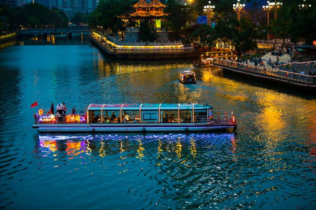 夜幕降臨,一個(gè)“月亮”裝置點(diǎn)亮四川成都錦江東門(mén)碼頭,人們?cè)诖伺抨?duì)等候登船體驗(yàn)“夜游錦江”項(xiàng)目。江面上,靈動(dòng)的“大魚(yú)”“神鳥(niǎo)”等飛行裝置伴隨游船行駛飛起;演員扮演嫦娥、玉兔、李白等為游客吟唱詩(shī)歌;火鍋船、“江上KTV”、萌寵專(zhuān)線等不同主題游船往來(lái)如織。江岸上,沿線茶百戲、漆扇和桂花香囊制作、漢服體驗(yàn)、潮玩市集、街頭藝人表演等豐富活動(dòng)吸引市民游客駐足體驗(yàn)。