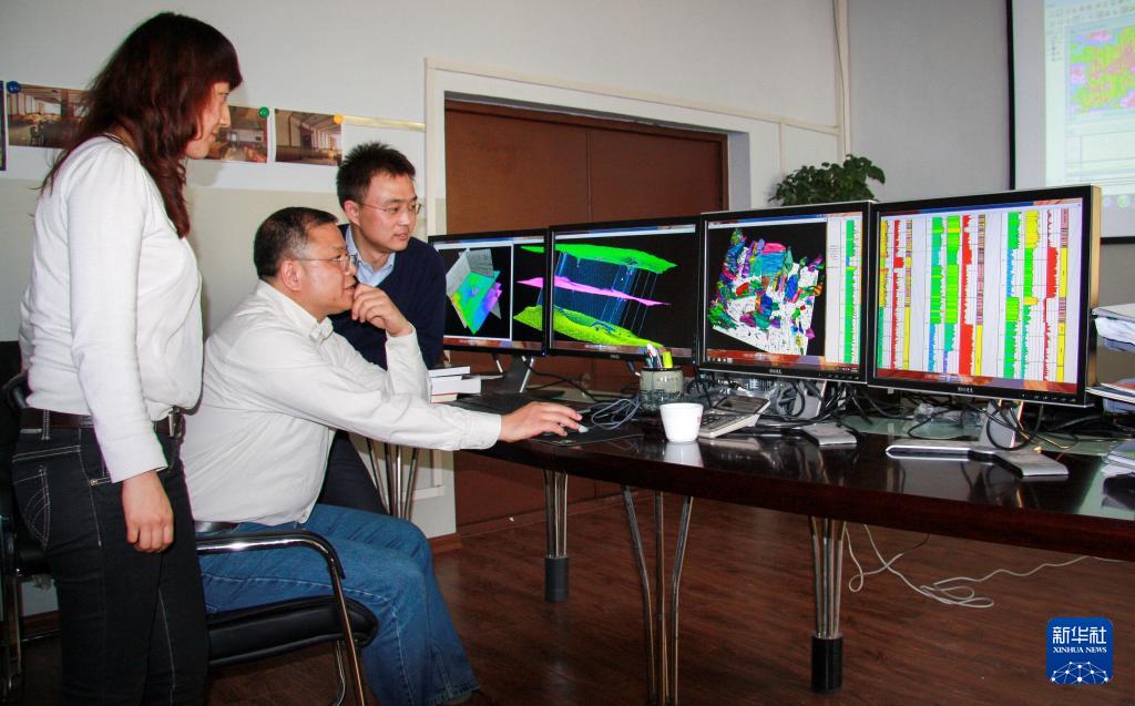 黃大年(左二)帶領(lǐng)科研團(tuán)隊(duì)成員研究問題(2010年11月22日攝)。 新華社發(fā)