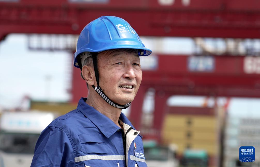 許振超在山東港口青島港集裝箱碼頭遠(yuǎn)眺(9月2日攝)。新華社發(fā)(閆軍攝)