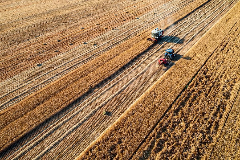 2024年5月27日,農(nóng)機(jī)手駕駛農(nóng)機(jī)在河南省商丘市梁園區(qū)孫福集鄉(xiāng)崔樓村收獲小麥(無人機(jī)照片)。新華社發(fā)(李恒 攝)