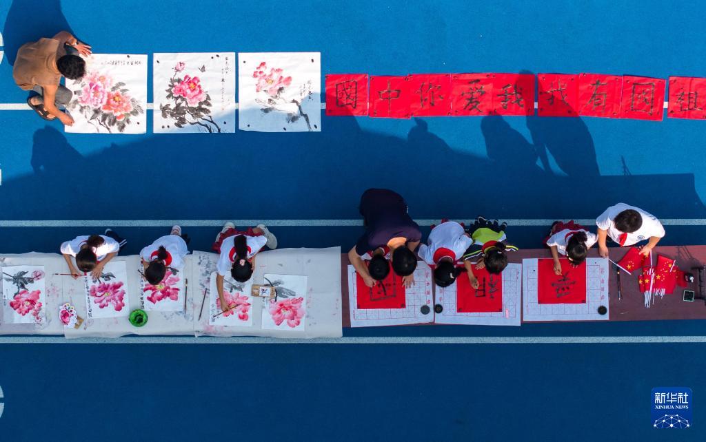 9月27日,在四川省眉山市彭山區(qū)鵬利小學(xué),學(xué)生通過書法和繪畫表達對祖國的祝福(無人機照片)。