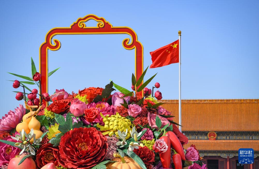 9月25日,五星紅旗在天安門(mén)廣場(chǎng)“祝福祖國(guó)”巨型花籃前飄揚(yáng)。