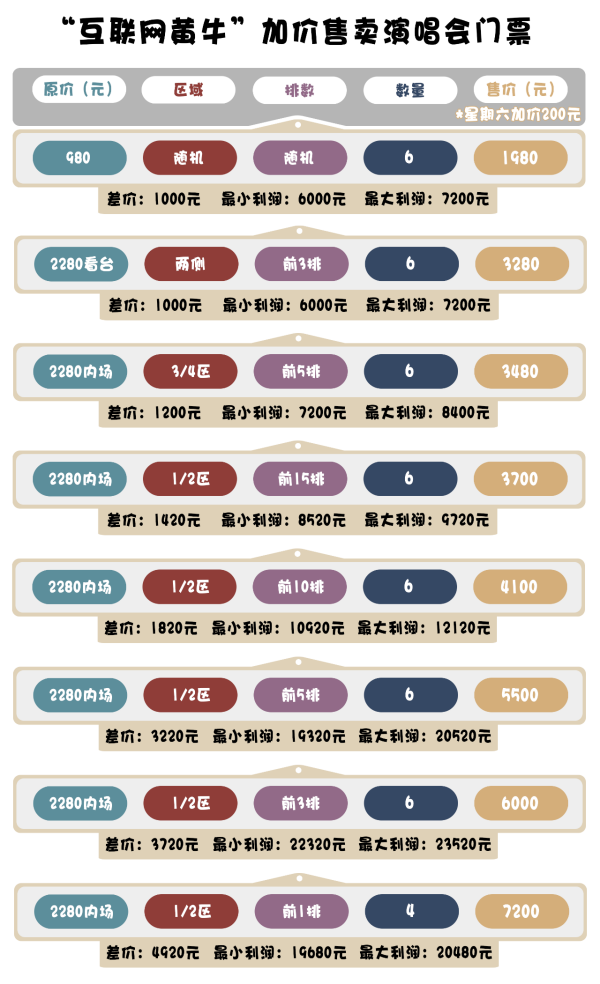 盡管如此,對于背后有二級資源的“互聯(lián)網(wǎng)黃?!眮碚f,售賣“黃?!逼辈⒉皇请y事。以某位在廣東地區(qū)深受歡迎的歌手為例,其預(yù)計(jì)在今年11月舉行多場個(gè)人演唱會,但有粉絲表示,演唱會的門票仍“一秒售罄”。某二手置物平臺數(shù)據(jù)顯示,演唱會門票并非全部售空,部分門票流入“互聯(lián)網(wǎng)黃牛”之手,原價(jià)為2280元的內(nèi)場票,因位置不同被炒至3280元至7200元不等。此外,若趕上演唱會在星期六舉辦,買家還需要額外支付200元的“熱門時(shí)段搶票費(fèi)用”。面對“一人一證”的入場機(jī)制,“互聯(lián)網(wǎng)黃牛”的生意似乎并未受到影響。