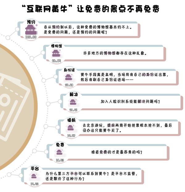 如此“作弊”手段引發(fā)輿論熱議。有網(wǎng)民表示,多地免費(fèi)景點(diǎn)都存在預(yù)約不上的現(xiàn)象,想去游玩必須花錢,其中博物館成“重災(zāi)區(qū)”;有網(wǎng)民感嘆“互聯(lián)網(wǎng)黃?!笔侄沃呙髁钊瞬坏貌环湟呀?jīng)默許了“互聯(lián)網(wǎng)黃?!爆F(xiàn)象;部分網(wǎng)民反映,某些第三方平臺上,免費(fèi)預(yù)約門票被裹上“講解服務(wù)”“研學(xué)套餐”等外衣,搖身一變成為貨架上的商品,不禁令人發(fā)問,“互聯(lián)網(wǎng)黃?!睘楹慰梢悦髂繌埬懙卦诘谌狡脚_上售賣免費(fèi)預(yù)約門票?是官方平臺監(jiān)管不力、置之不理,還是其授意“互聯(lián)網(wǎng)黃?!迸c第三方平臺相互串通謀取利益?