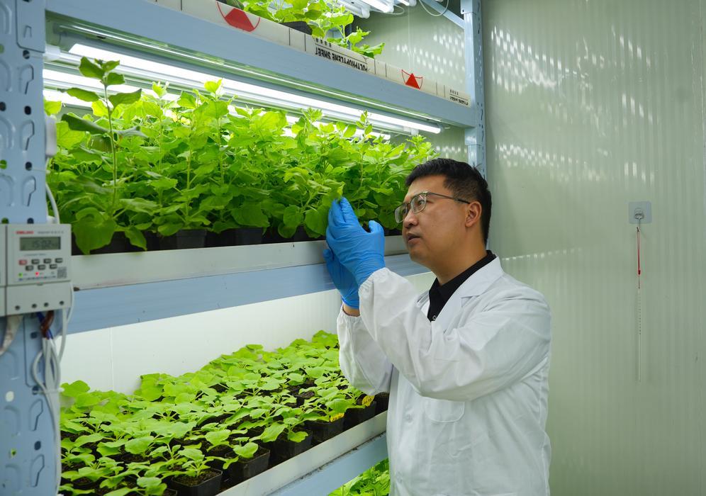 神筆生物創(chuàng)始人李仁漢在實驗室觀察發(fā)光植物生長情況(10月10日攝)。新華社發(fā)