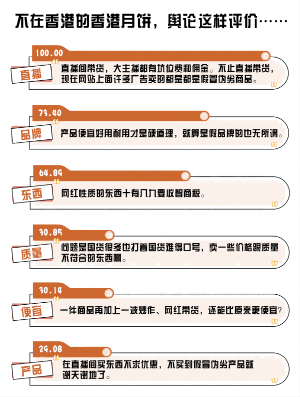“香港美誠(chéng)月餅”事件引發(fā)網(wǎng)民圍觀,有網(wǎng)民評(píng)論稱,售賣假冒偽劣商品現(xiàn)象不止存在于直播帶貨中,某些網(wǎng)站的廣告也是虛假?gòu)V告,二者的共同點(diǎn)是:有錢掙就行,質(zhì)量無需把關(guān);有網(wǎng)民表示,在直播間買東西不求有多優(yōu)惠,只求商品保真,但這一觀點(diǎn)也遭到了質(zhì)疑,有網(wǎng)民認(rèn)為這跟某些主播宣稱為廣大粉絲“把價(jià)格打下來”“謀福利”的口號(hào)相去甚遠(yuǎn),消費(fèi)者不應(yīng)該“退而求其次”;還有網(wǎng)民認(rèn)為,哪兒生產(chǎn)的不重要,牌子也不重要,貨真價(jià)實(shí)才最重要。