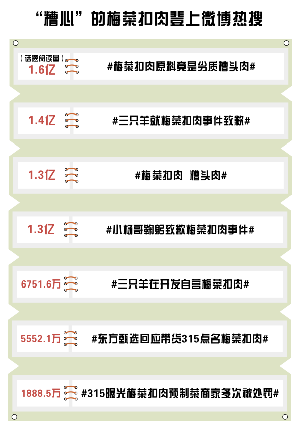 在引發(fā)行業(yè)震蕩后,該事件的影響從預(yù)制菜領(lǐng)域蔓延到直播帶貨領(lǐng)域,原因是東方甄選、主播“瘋狂小楊哥”以及其所屬的三只羊網(wǎng)絡(luò)科技有限公司均在直播間售賣過該產(chǎn)品。消息一出,輿論嘩然。對(duì)此,東方甄選、主播“瘋狂小楊哥”、三只羊網(wǎng)絡(luò)均作出回應(yīng)并致歉。從相關(guān)微博話題來看,“#梅菜扣肉原料竟是糟頭肉#”“#三只羊就梅菜扣肉事件致歉#”“#小楊哥鞠躬致歉梅菜扣肉事件#”等話題閱讀量均超過1.3億,輿論聲量頗高。