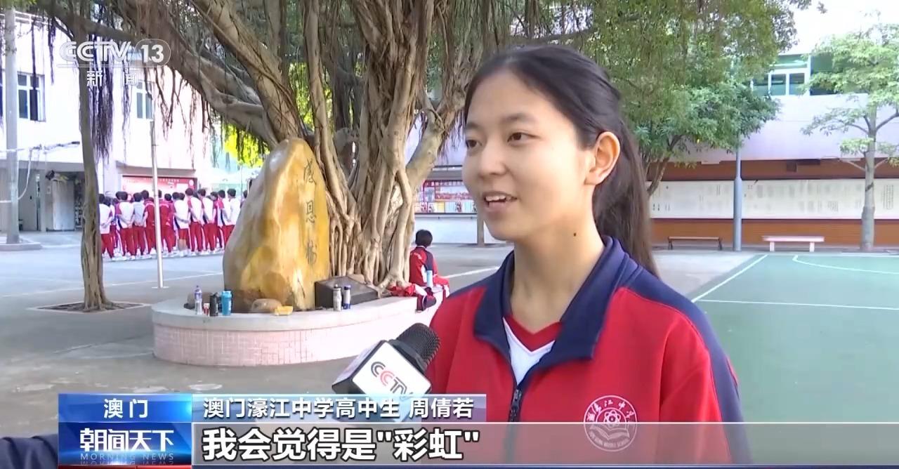 澳門濠江中學(xué)高中生 周倩若:我會覺得是“彩虹”,因?yàn)椴屎缡怯泻芏囝伾模@種七彩的顏色,也代表了多彩的未來。澳門回歸祖國25周年,我希望也許在下一個25周年的時候,這7個顏色的彩虹,每一條顏色由我們這一代人給它填上顏色,不管是在科技領(lǐng)域還是在體育方面,在各行各業(yè)都有我們這一代人的身影。我覺得當(dāng)我們成長為可以由我們來書寫澳門的七彩彩虹的時候,相信澳門一定是發(fā)展得更好。