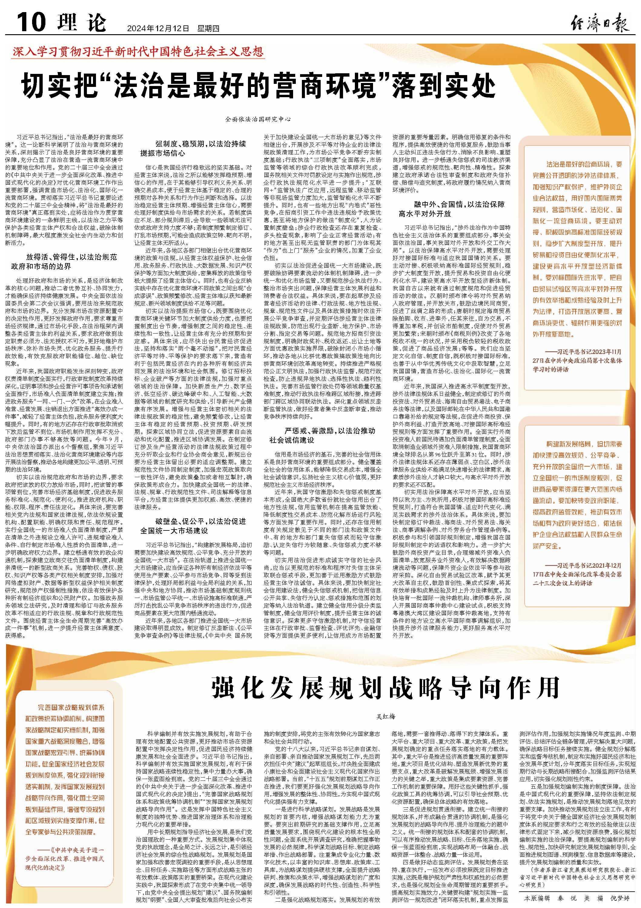 習近平總書記指出,“法治是最好的營商環(huán)境”。這一論斷科學闡明了法治與營商環(huán)境的關系,深刻揭示了法治是良好營商環(huán)境的重要保障,充分凸顯了法治在營造一流營商環(huán)境中的重要地位和作用。黨的二十屆三中全會通過的《中共中央關于進一步全面深化改革、推進中國式現(xiàn)代化的決定》對優(yōu)化營商環(huán)境工作作出重要部署,強調(diào)營造市場化、法治化、國際化一流營商環(huán)境。貫徹落實習近平總書記重要論述和黨的二十屆三中全會精神,將“法治是最好的營商環(huán)境”真正落到實處,應將法治作為貫穿營商環(huán)境建設的一條鮮明主線,以法治之力平等保護各類經(jīng)營主體產(chǎn)權(quán)和合法權(quán)益,破除體制機制障礙,最大程度激發(fā)全社會內(nèi)生動力和創(chuàng)新活力。