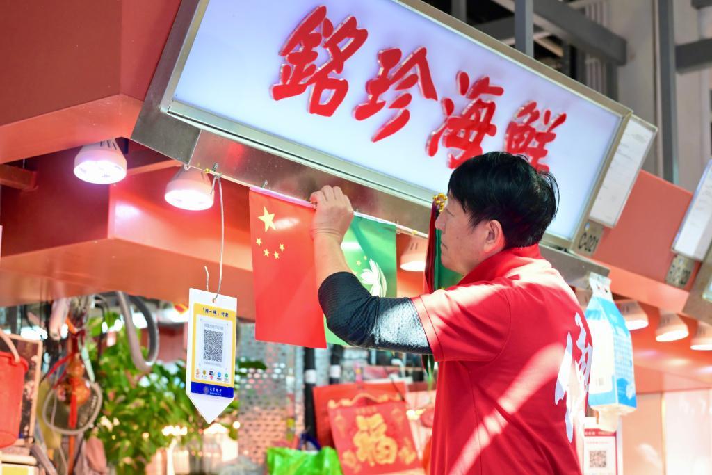12月18日,澳門紅街市的一家魚檔業(yè)主關(guān)偉銘在檔位上掛起嶄新的國旗區(qū)旗。新華社記者 朱煒 攝