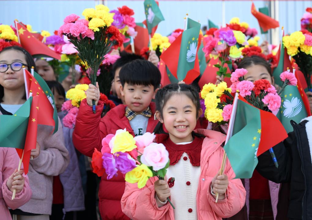 在澳門國際機(jī)場(chǎng),澳門警察樂隊(duì)奏響熱情洋溢的歡迎曲,舞龍舞獅表演喜氣歡騰。數(shù)百名澳門青少年和各界群眾代表揮動(dòng)國旗、特別行政區(qū)區(qū)旗和鮮花,表達(dá)熱烈的歡迎。
