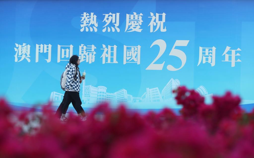 12月17日,行人經(jīng)過(guò)澳門科技大學(xué)校園內(nèi)的一處慶祝海報(bào)。新華社記者 姚琪琳 攝