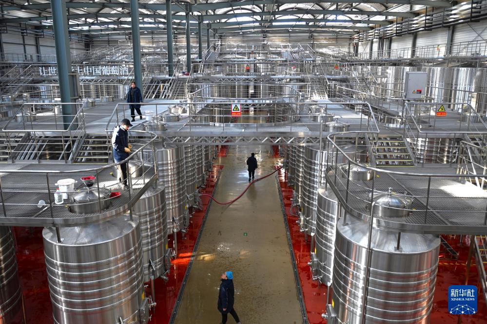 11月27日,技術(shù)人員在位于寧夏青銅峽市的西鴿酒莊釀造車間工作。