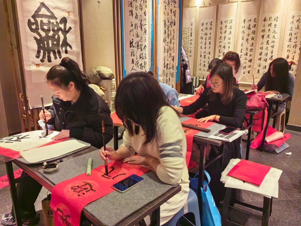 “千門歡洽有常樂,萬物光華同此春”。三個小時的課程結(jié)束后,呂海剛寫完了一副春聯(lián)。