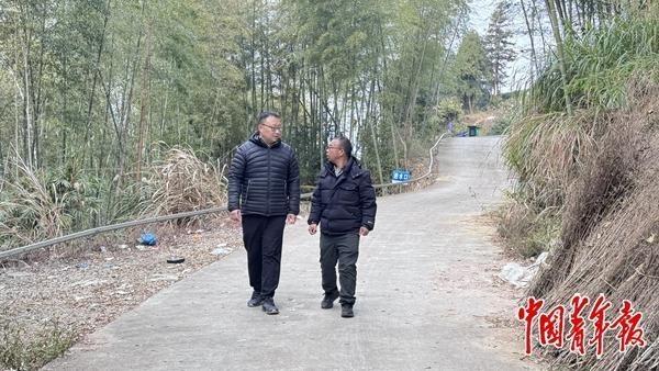 1月8日,雙峰村駐村第一書記劉祥(左)和村支部書記陳家凱(右)去看望低收入農(nóng)戶。中青報·中青網(wǎng)見習記者 趙麗梅/攝