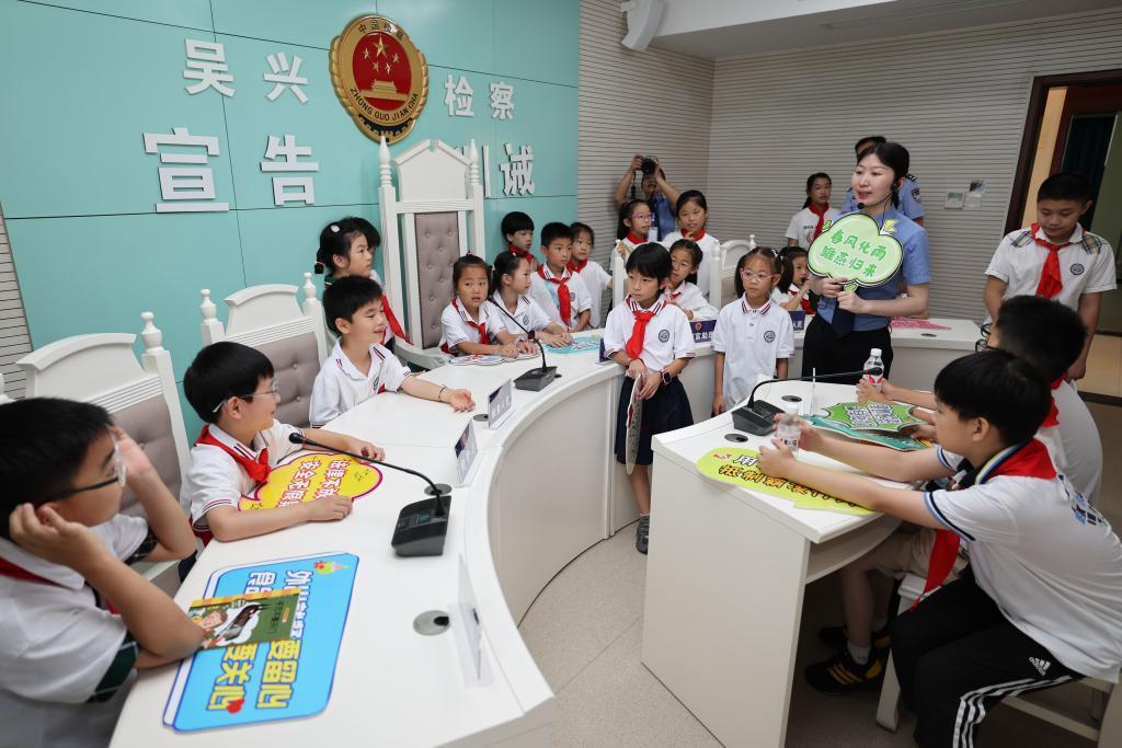2024年7月3日,湖州市吳興區(qū)人民檢察院檢察官帶領小學生參觀未成年人檢察辦案區(qū)。新華社記者 黃宗治 攝