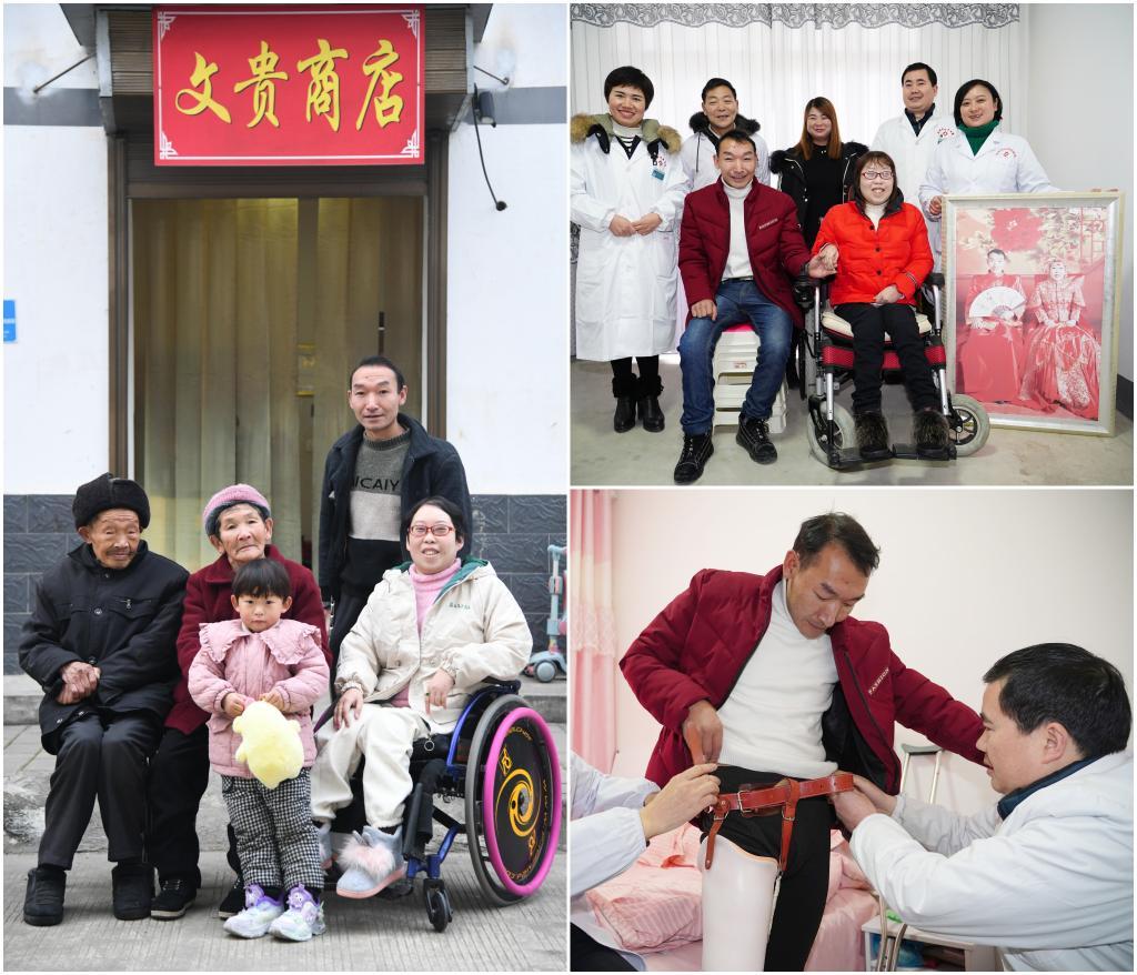 這是一張拼版照片。左圖為:2024年12月29日,牟文貴(后)、曹曉霞(右一)與家人在自家開設(shè)的商店前合影(新華社記者張博文攝);右上圖為:2019年1月6日,新年剛拍完結(jié)婚照的牟文貴(前左)夫婦與他們的家庭醫(yī)生簽約服務(wù)團(tuán)隊(duì)合影(新華社記者邵瑞攝);右下圖為:2019年1月6日,家庭醫(yī)生團(tuán)隊(duì)的醫(yī)生在為右腿截肢的牟文貴(中)穿戴義肢(新華社記者邵瑞攝)。