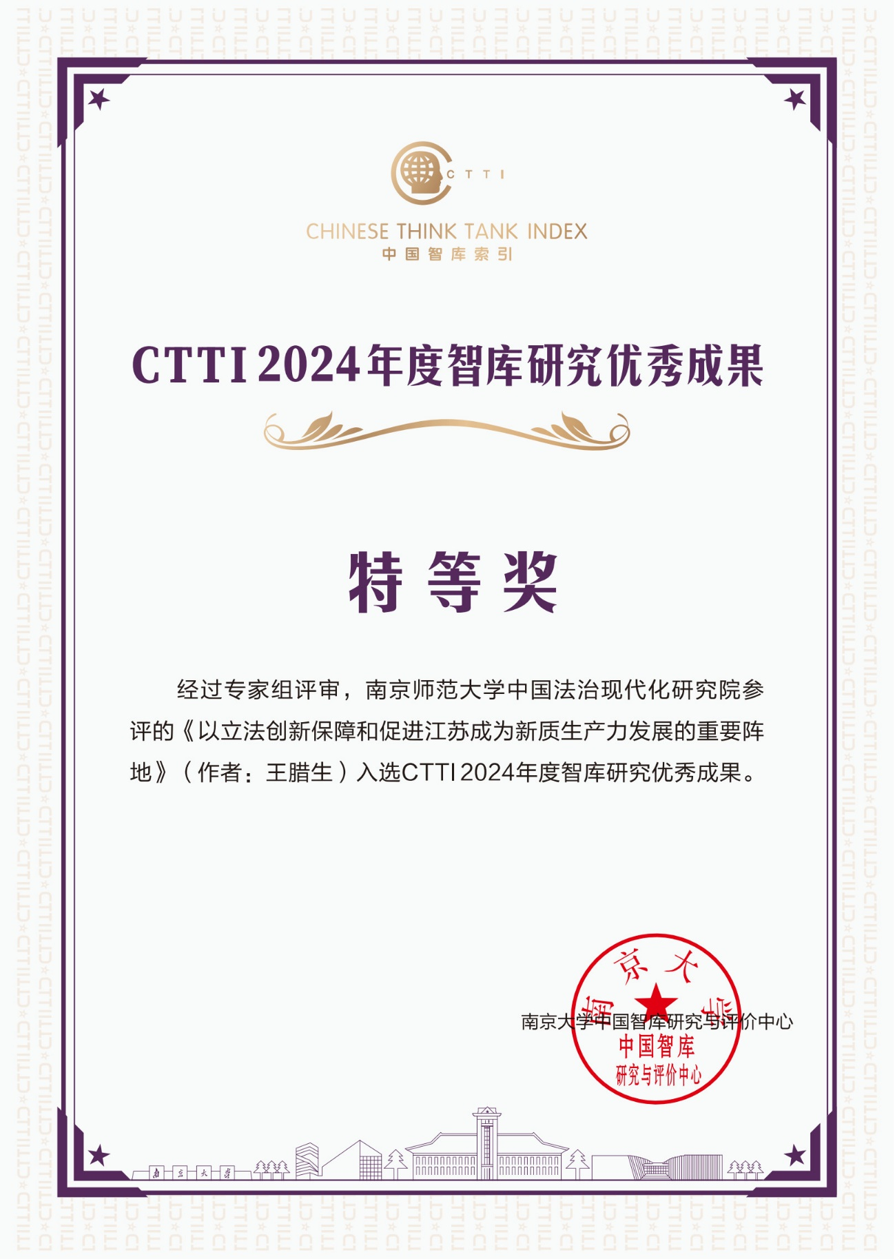 2024年12月7日,南京大學(xué)中國智庫研究與評價中心公布,南京師范大學(xué)中國法治現(xiàn)代化研究院的《以立法創(chuàng)新保障和促進江蘇成為新質(zhì)生產(chǎn)力發(fā)展的重要陣地》被評選為CTTI2024年度智庫研究優(yōu)秀成果特等獎。
