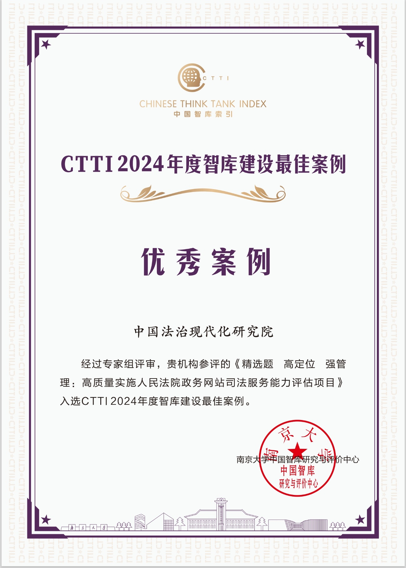 2024年12月7日,南京大學中國智庫研究與評價中心公布,南京師范大學中國法治現代化研究院的《精選題 高定位 強管理:高質量實施人民法院政務網站司法服務能力評估項目》入選CTTI2024年度智庫建設最佳案例優(yōu)秀案例。