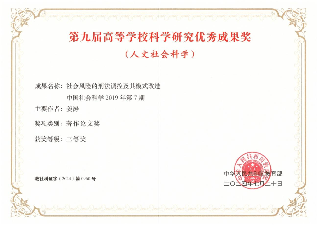 2024年7月,南京師范大學(xué)中國法治現(xiàn)代化研究院研究員姜濤的論文《社會風(fēng)險的刑法調(diào)控及其模式改造》榮獲第九屆高等學(xué)??茖W(xué)研究優(yōu)秀成果獎(人文社會科學(xué))三等獎。
