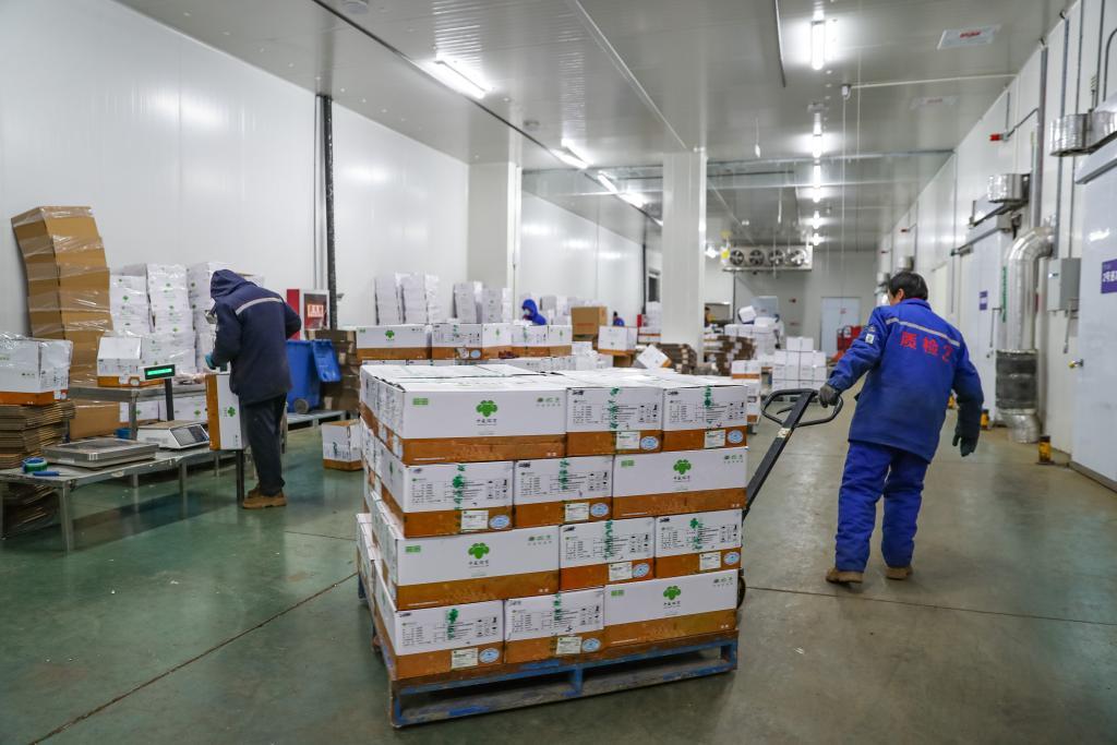 1月8日,在環(huán)縣中盛羊業(yè)加工車(chē)間,工作人員轉(zhuǎn)運(yùn)羊肉準(zhǔn)備發(fā)貨。 新華社記者郎兵兵 攝
