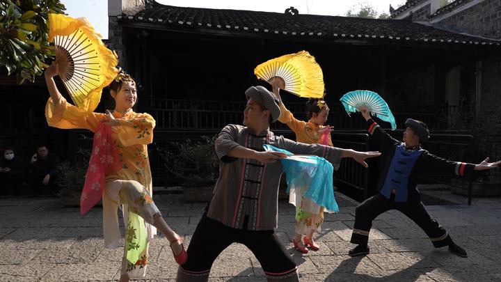 圖為1月16日秀山花燈表演者在位于重慶市秀山土家族苗族自治縣的洪安古鎮(zhèn)內(nèi)進(jìn)行表演前的排練。新華社記者 李愛斌 攝
