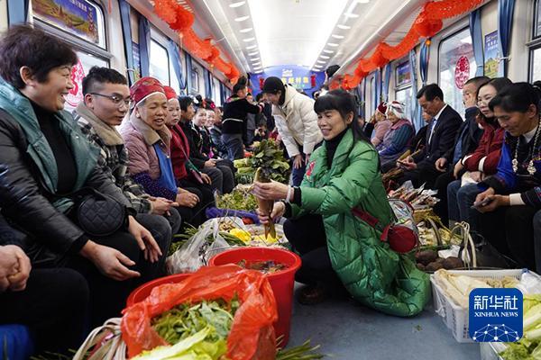 18日15點40分左右,在貴陽開往玉屏的5640/39次“村火車”上,由國鐵成都局貴陽客運段開設的“新春年貨鋪”連續(xù)第7年開張營業(yè)。