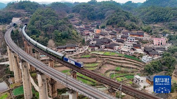 1月18日,5640次列車駛過貴州省凱里市爐山鎮(zhèn)六個雞村(無人機照片)。新華社發(fā) (龍建睿 攝)
