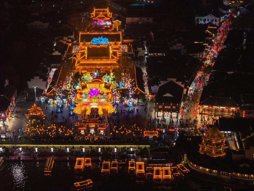 這是1月21日在江蘇南京夫子廟展區(qū)拍攝的燈組(無(wú)人機(jī)照片)。新華社記者 李博 攝