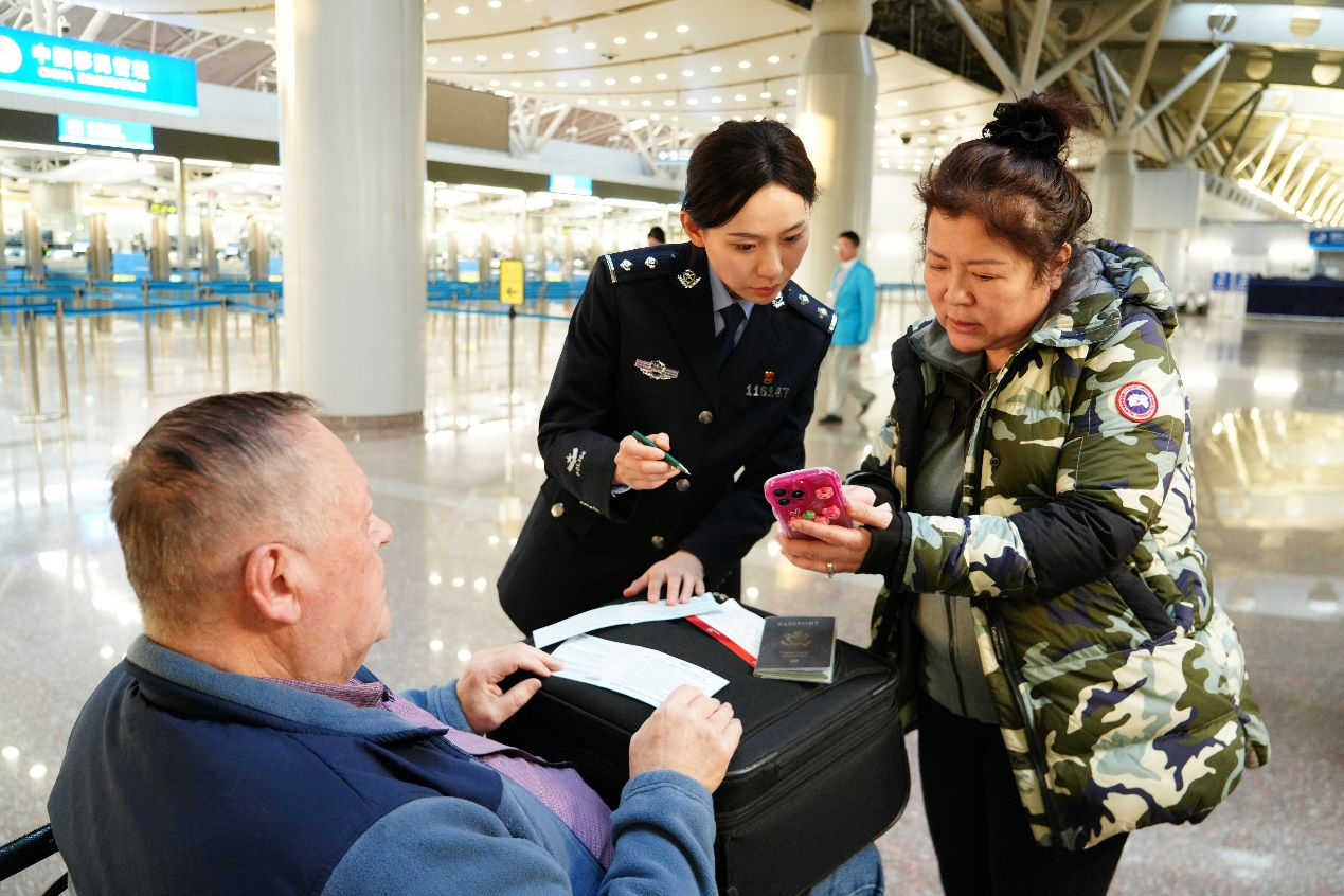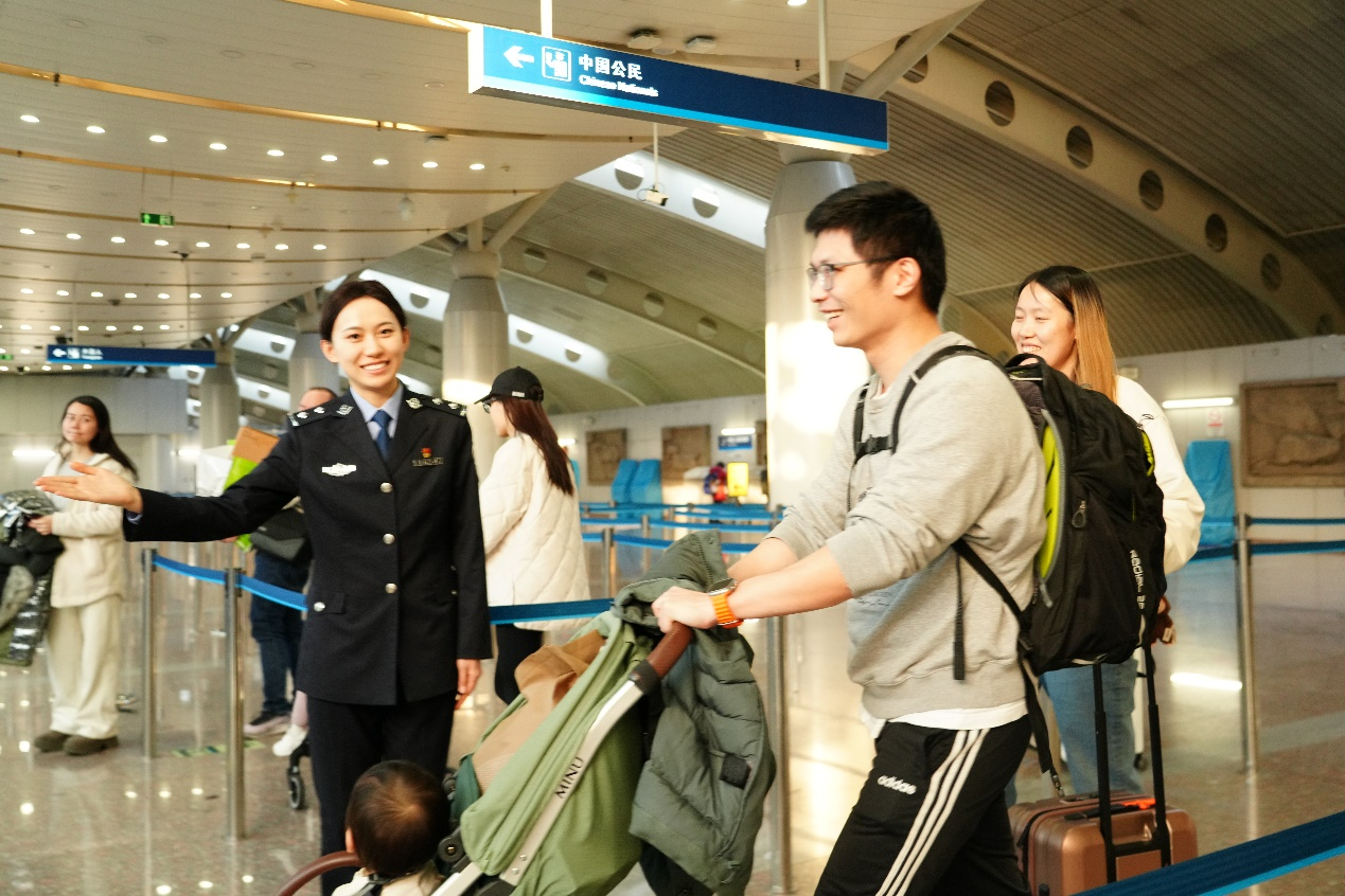 來自北京邊檢總站執(zhí)勤六大隊的杜希銘,早早站在“特別通道”前等待旅客們的到來?!疤貏e通道”是專門為老人、兒童、殘障人士等設(shè)置,方便他們更快捷地通過。看到一家人推著兒童車走到入境檢查點,杜希銘連忙走上前去,微笑著指引著他們走“特別通道”通過。