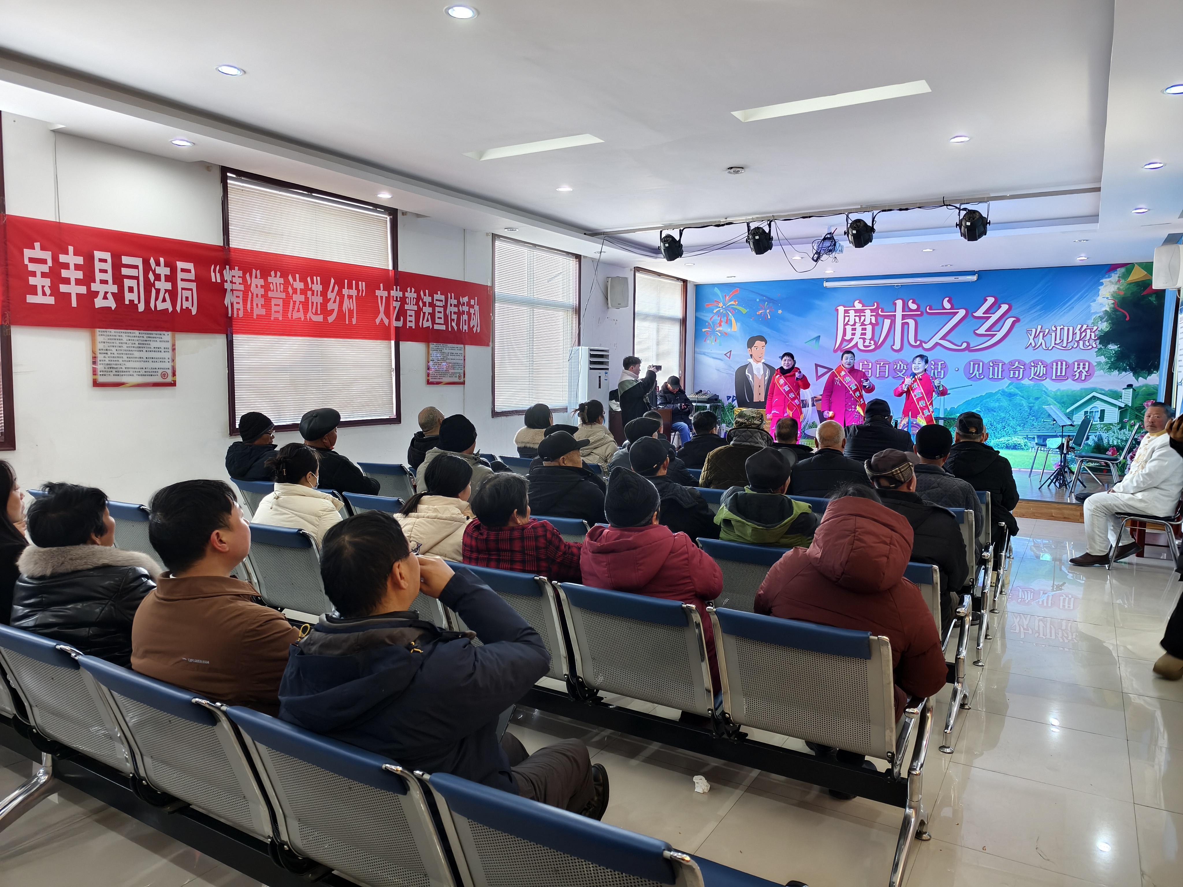 站在多功能教室門口,東邊靠墻設(shè)置成一個寬約5米、進深約3米、高約0.2米的小舞臺,舞臺背景墻“魔術(shù)之鄉(xiāng)”四個大字格外醒目。其他空間擺放著8排椅子,每排8個位子,基本上坐滿了村民。背面墻上掛著一條紅色橫幅——寶豐縣司法局“精準普法進鄉(xiāng)村”文藝普法宣傳活動。