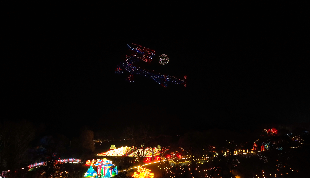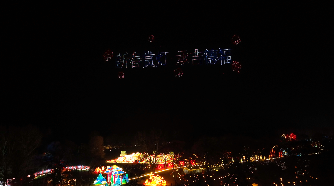 隨著夜色漸深,避暑山莊內(nèi)的氣氛也達到了高潮。1000架無人機緩緩升空,它們在天空中排列成各種圖案,從象征吉祥如意的傳統(tǒng)圖案到展現(xiàn)承德自然風光的標志性建筑,無不令人贊嘆。觀眾紛紛舉起手機,記錄下這一震撼人心的瞬間。其中,“新春賞燈,承吉德?!钡淖謽佑绕湟俗⒛浚粌H是對新年的美好祝愿,更是對中國傳統(tǒng)文化的生動體現(xiàn)。