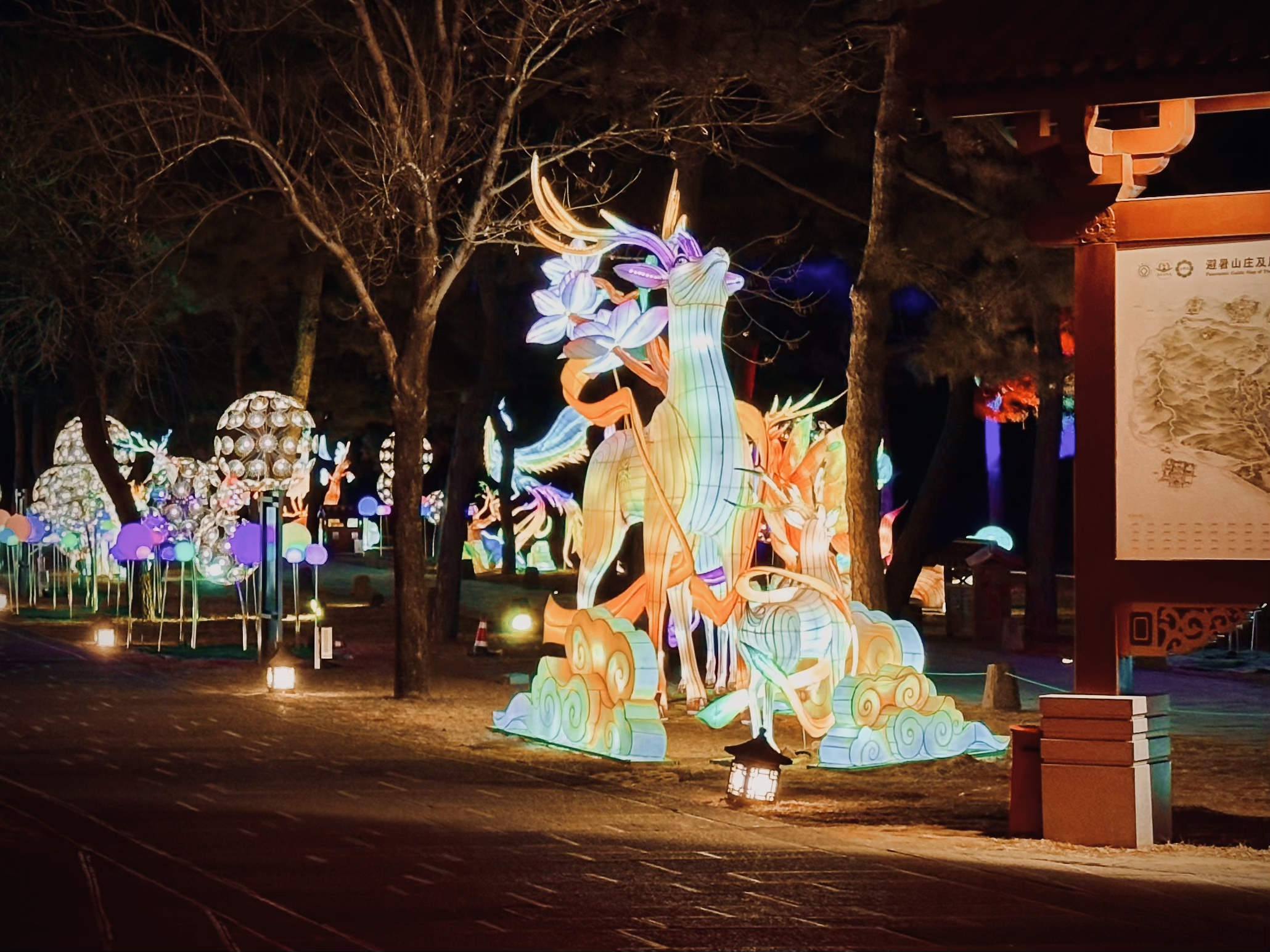 在爭奇斗艷的各種燈組中,最引人注目的,當屬位于萬樹園中央的“皇家印璽”燈組。它以四方印為母題,巨大的紅印章造型仿佛印刻在萬樹園的草地上。內(nèi)部設有四個入口,游客可以穿梭其中,感受起伏山巒的設計理念。立面上展示了山莊內(nèi)康乾七十二景相關的詩詞,每處景觀都有詳細的注釋,使游客在欣賞美景的同時,也能深入了解山莊的歷史文化。