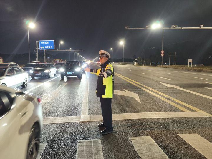 1月25日晚,張潔在樂山市蘇稽新區(qū)西岸路口指揮疏導(dǎo)交通。新華社發(fā)(劉冉攝)