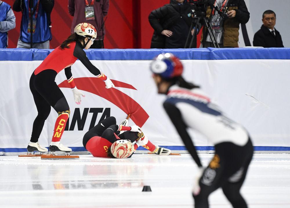 2024年12月7日,中國(guó)隊(duì)選手王曄(中)在2024-2025賽季國(guó)際滑聯(lián)短道速滑世界巡回賽北京站女子3000米接力A組決賽中受傷。新華社記者 鞠煥宗 攝