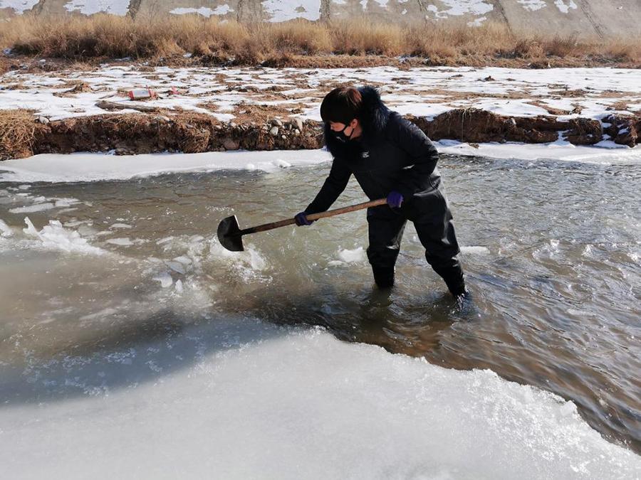 臨洮水文站的工作人員在觀測點人工破冰。(受訪者供圖)
